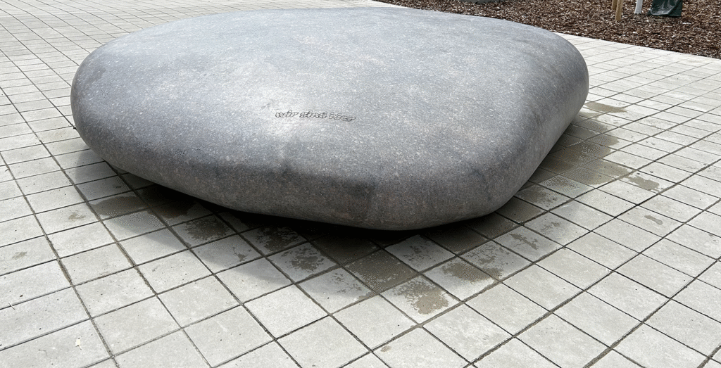 “We are here,” that is, the manifestation of the present, the here and now, is expressed in slightly deepened (about 0.5cm) font quarter circle letters discreetly incorporated on the top of the stone with a font height of about 4cm.